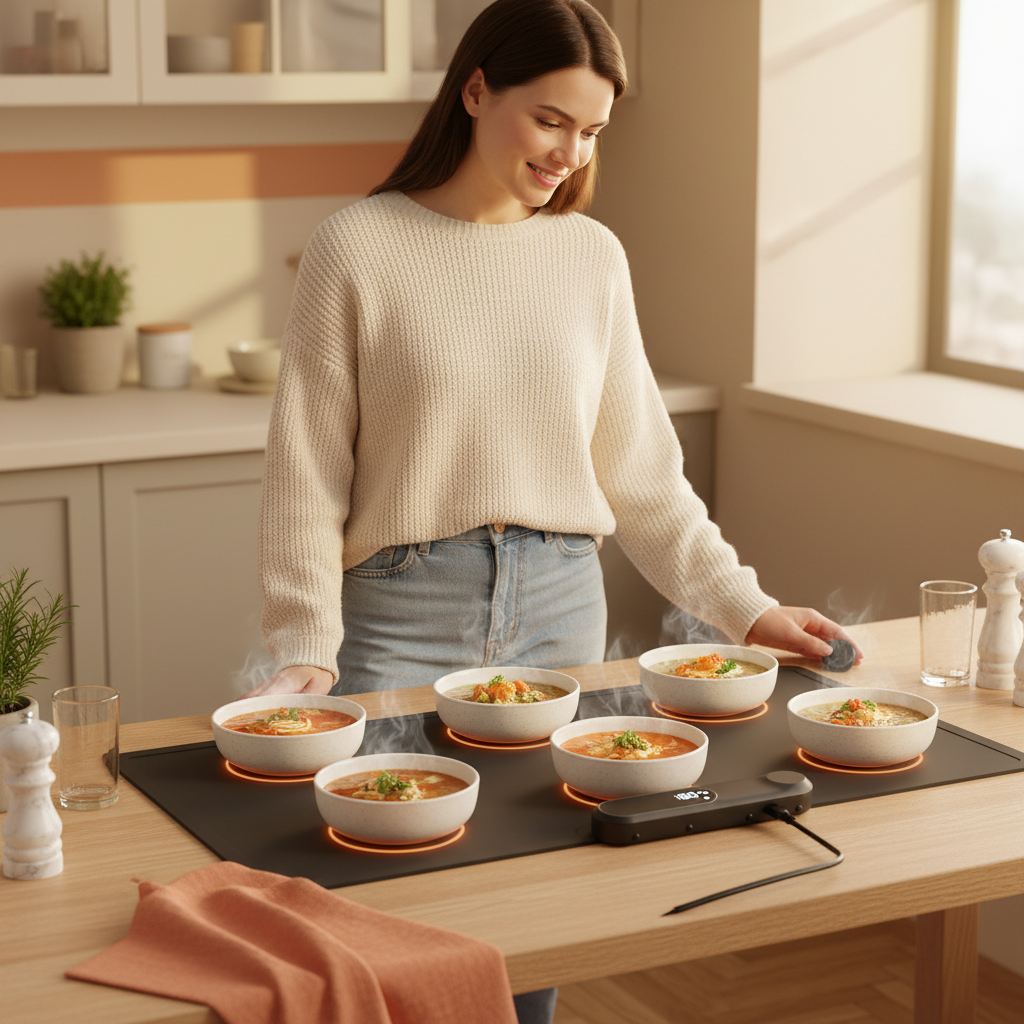 The mat is optimized for six large plates, ensuring even heat distribution. Smaller dishes can be added in between.
